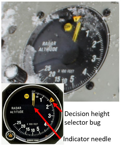 A decision height selector bug allows the pilot to choose a minimum height (Figure 2). If the aircraft descends below the selected minimum height, a light illuminates and an alarm sounds to notify the pilot. The decision height selector bug on the radio altimeter found at the accident site was set to 0 feet.