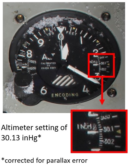 The altimeter setting on the occurrence aircraft’s conventional altimeter read 30.13 inches of mercury (inHg) (Figure 3). The atmospheric pressure at CYTF at the time of the accident was 30.08 inHg, which represents a 50-foot overestimation of the indicated altitude.