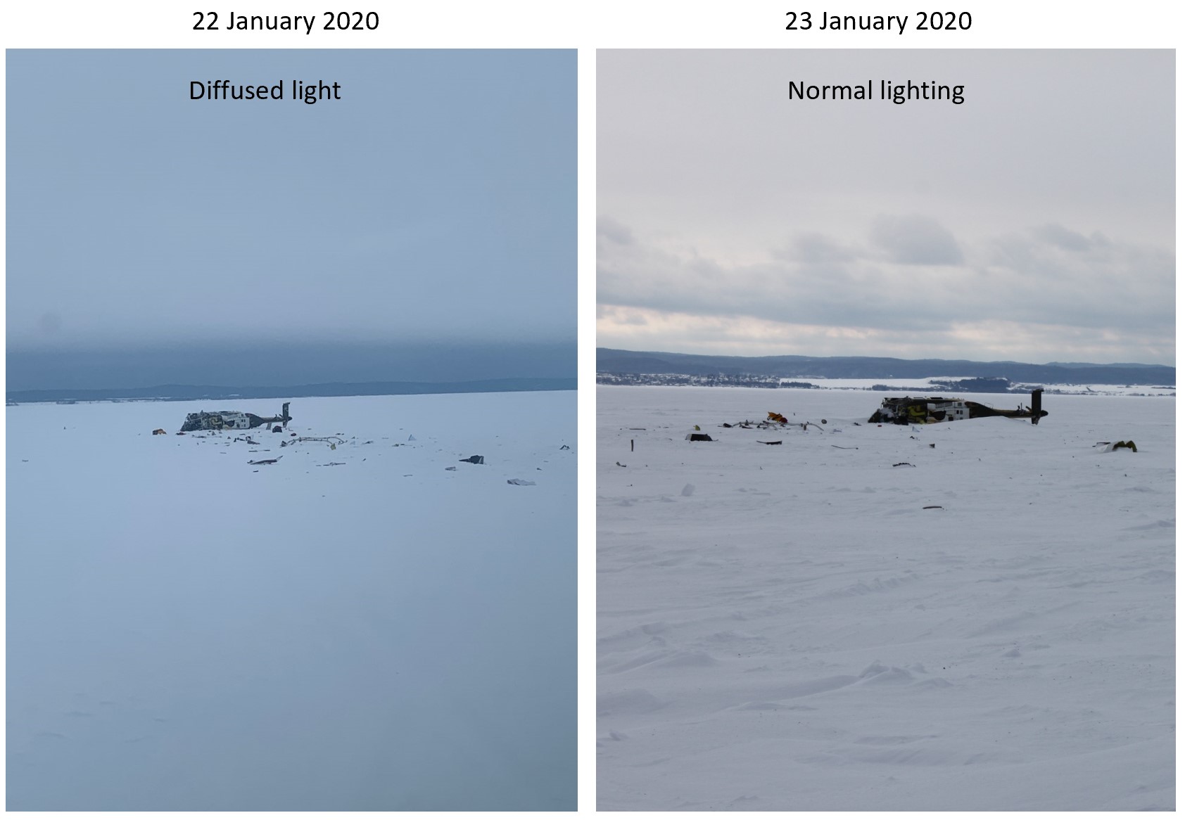 The diffused light on the day of the accident reduced shadows and contrast on the lake’s snow-covered surface (Figure 4). In addition, given that the accident occurred at around 1400, a little more than 2 hours before sunset,Footnote 5 the light had already begun to fade, making it more difficult to perceive details.