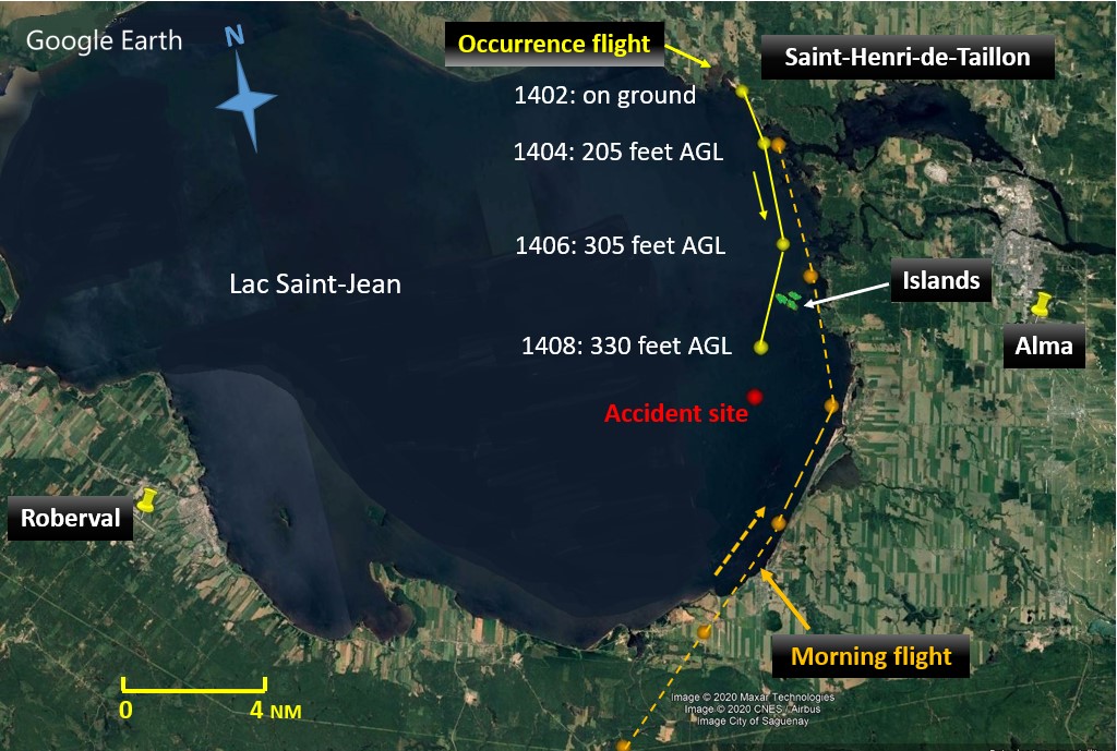 From 1130 until 1219, the occurrence pilot conducted searches at very low altitude, less than 100 feet above the frozen surface of Lac Saint-Jean, in the vicinity of the islands near La Grande Décharge Lake (Figure 1).