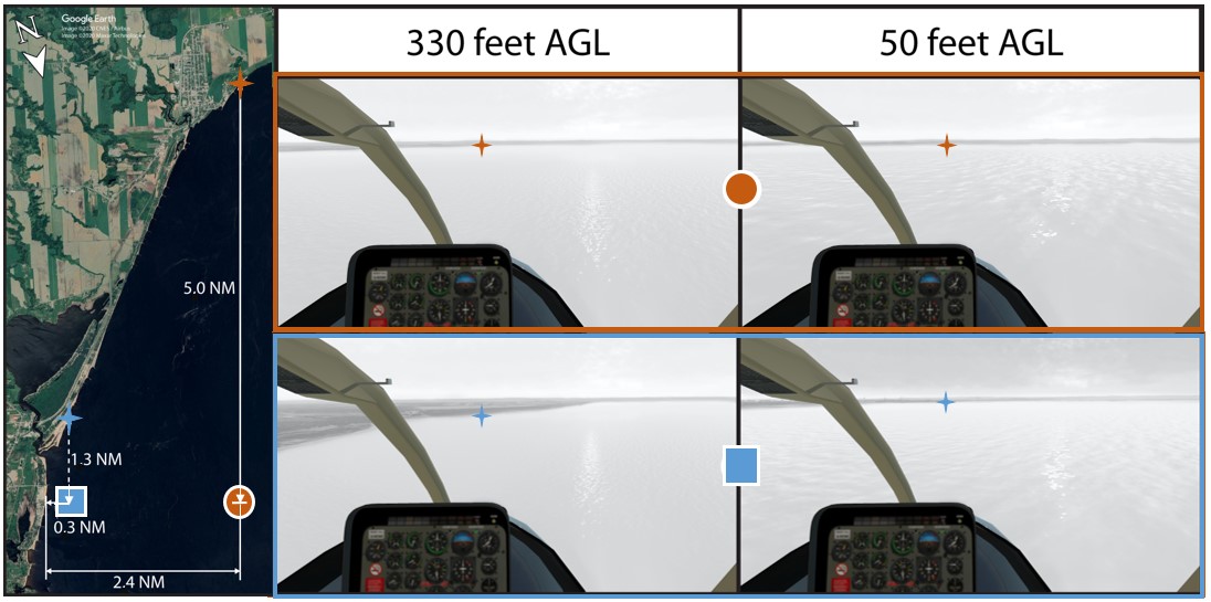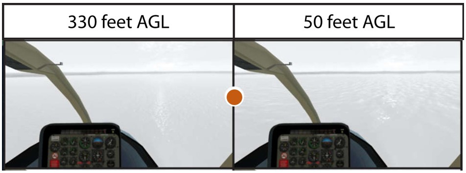 When flying alongside lakeshores, use them as a reference point. Even if you can see the other side, realize that your depth perception may be poor and it is easy to fly into the surface. If you must cross the lake, check the altimeter frequently and maintain a safe altitude while you still have a good reference. Don’t descend below that altitude.Footnote 10