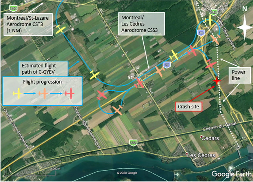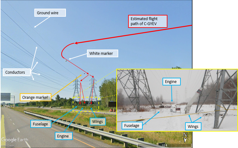 Figure 3 shows the aircraft’s estimated path, as well as the markers and wires that were struck. It also provides an image of the crash site and wreckage.