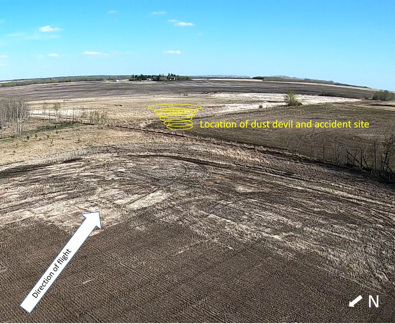 One minute before the accident, the pilot performed an approach to the take-off area in a southeasterly direction. Just before touchdown, power was applied and a go-around to the south was commenced. When it was approximately 75 feet above ground level, the aircraft flew through a dust devil (Figure 2). Without input from the pilot, the aircraft’s climb rate suddenly increased, the aircraft rolled sharply to the right, and the paraglider lines wrapped around the pilot, the trike, and the turning propeller, eventually collapsing the entire canopy. At approximately 1745, control was lost and the aircraft impacted the ground, fatally injuring the pilot.