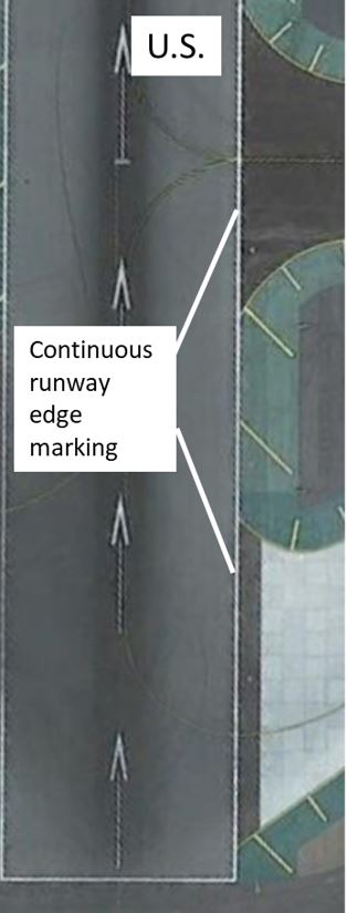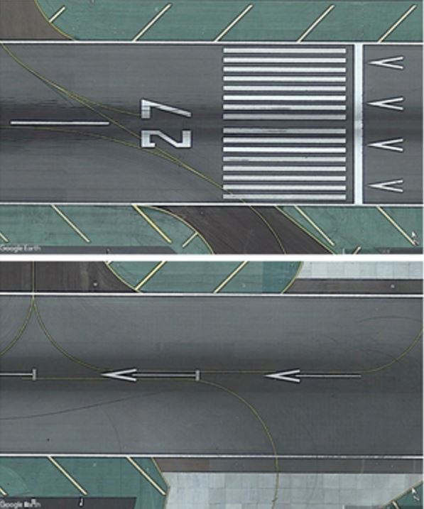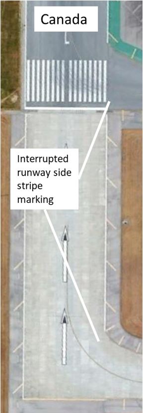 Runway 27 had a displaced threshold, and the investigation compared the visual environment of a displaced threshold area with that of a runway threshold. It was found that if flight crews line up on runways in the area before the displaced threshold or conduct intersection departures, both under degraded or nighttime visual conditions and without confirming the aircraft's lateral position on the runway, there is an increased risk of runway misalignments or runway side excursions. This is because displaced threshold areas and runway-taxiway intersections do not have runway threshold markings or runway numbers, 2 distinctive features that allow flight crews to define the width—and therefore, the centreline—of the runway.