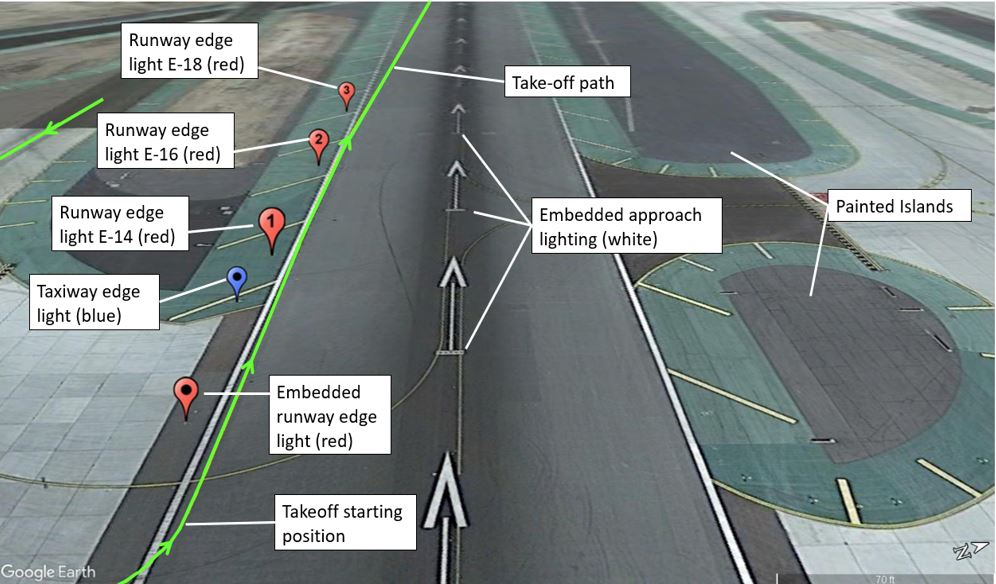 - During the take-off roll, the aircraft’s left main landing gear wheels contacted and severed 3 runway edge lights, causing damage to the aircraft’s tires and flaps.