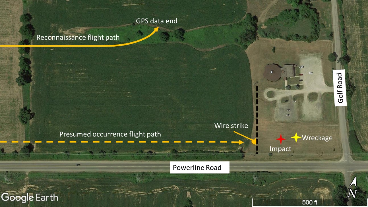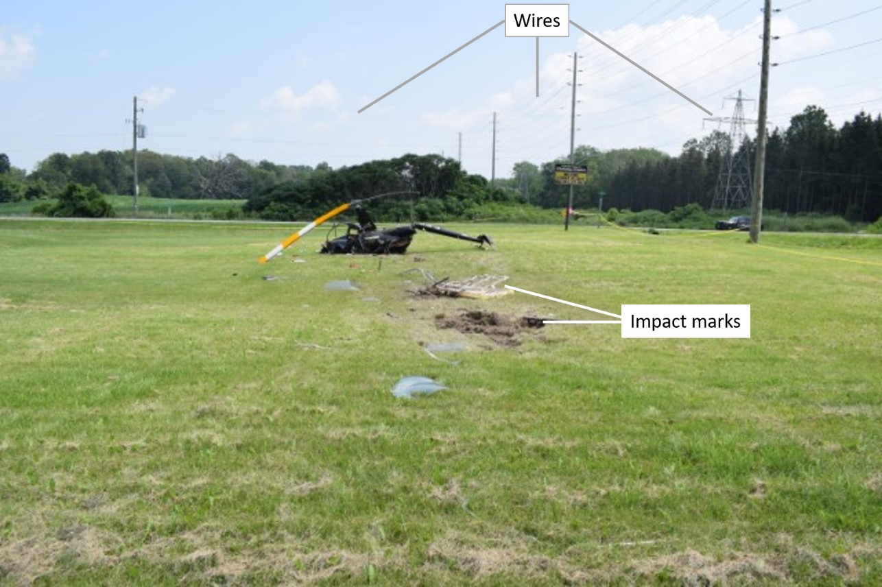 The helicopter presumably flew parallel to the south edge of the field, on a heading of approximately 077° magnetic (M). At 0659:44, it struck wires at a height of approximately 30 feet AGL. Control of the helicopter was lost, and the helicopter collided with the ground before coming to rest on a grassy field approximately 270 feet beyond the wire strike location.