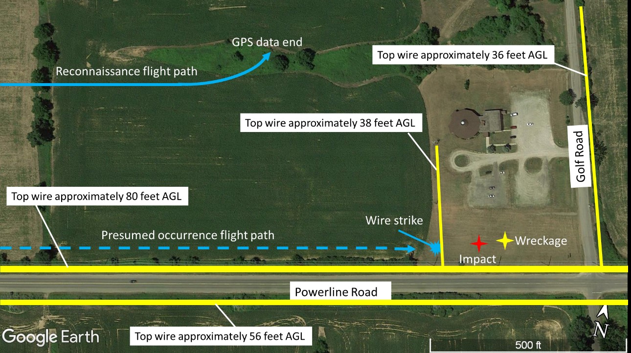 The wires that were struck were significantly less prominent. Instead of running along a roadside or the church driveway, they ran along the edge of a corn field, which is not where pilots expect to see them, nor where they focus on scanning for hazards. These wires were lower than the 2 prominent sets of wires running east to west, and the bases of their associated poles were obscured by the corn. Consequently, they were more difficult to detect from the air, especially when viewed from the west.