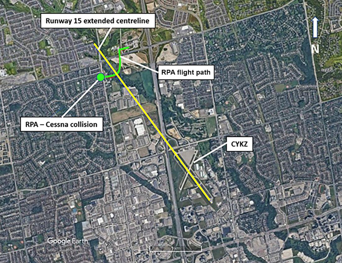 The RPA was in a stationary hover for more than 2 minutes when, at 1301, a collision occurred with the Cessna, which was on final approach for Runway 15 (Figure 1), approximately 1.2 NM from the threshold, and travelling at approximately 65 knots.