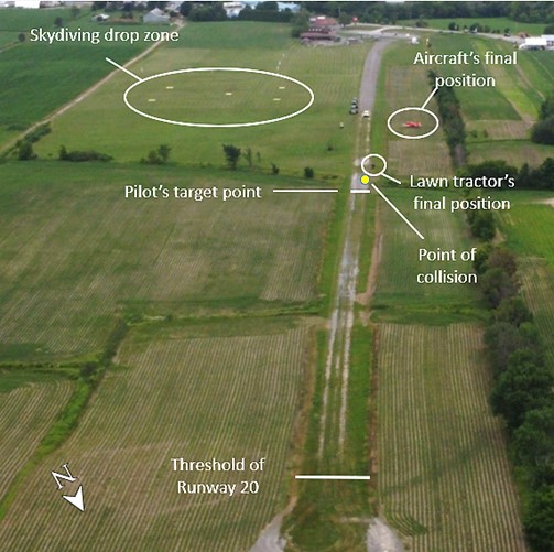 After the Twin Otter had landed, the pilot of the Nanchang, who did not see any traffic in the circuit or on the ground, joined the left base leg of the circuit at an altitude of approximately 500 feet above ground level (AGL) before turning onto final at approximately 300 feet AGL. Because the surface of the grass strip runway was in poor condition at the threshold and beyond, the pilot chose a target point approximately 800 feet beyond the threshold and began to flare approximately 300 feet before the target point (Figure 1). At about the same time, a lawn tractor that was performing maintenance work at the aerodrome crossed Runway 20 near the pilot’s intended target point and began a turn to the left to cut the grass parallel to the runway.
