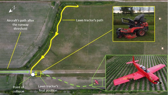 Seeing damage to the right wing, the pilot realized that he had struck something. He exited the aircraft and saw the lawn tractor to the right of the runway not very far from the touchdown point. The aircraft had struck the tractor, and the driver was fatally injured. The pilot was not injured. There was major damage to the aircraft’s right wing (Figure 2).