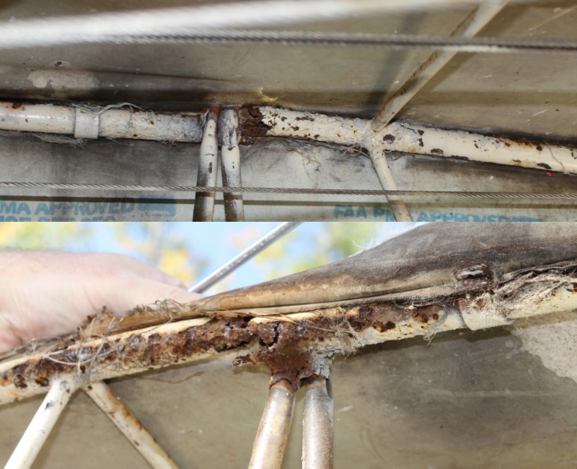 The wooden block supporting the battery showed significant signs of deterioration over time. Also, the steel tube structure below the battery showed significant signs of corrosion; it was severed in 2 places due to this corrosion (Figure 3). The technical record for the airframe made no mention of structural corrosion following the annual inspection of the aircraft in June 2021. One area of corrosion was visible from the outside, and another area was visible through a hatch that could be opened by an aircraft maintenance engineer during an annual inspection. There is no indication that the corrosion found during the investigation played a role in this occurrence.