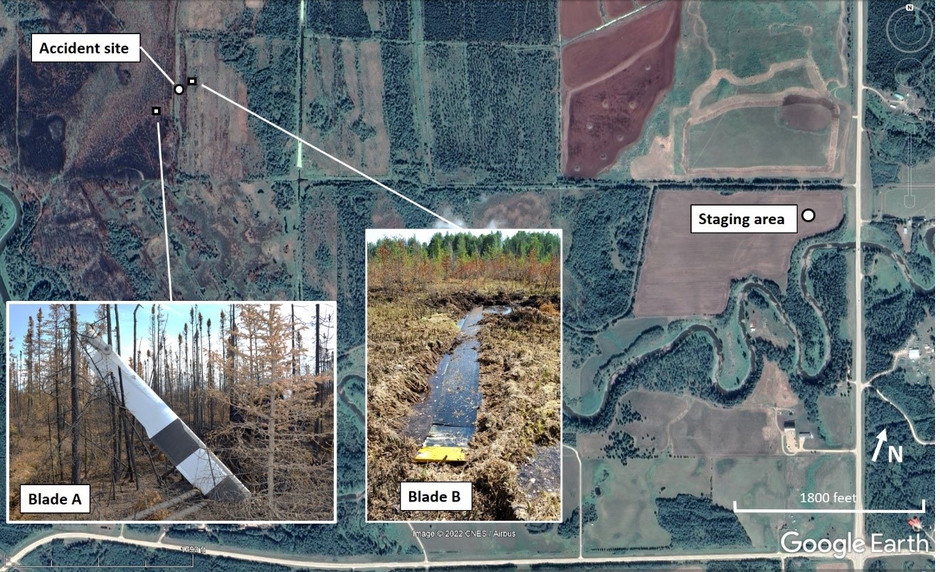 The first main rotor blade to separate from the helicopter (blade A, Figure 3) came to rest in a burned out bush area approximately 460 feet southwest of the main wreckage site. The tip of this blade was buried in the muskeg approximately 10 feet deep, with the blade grip end pointing up.