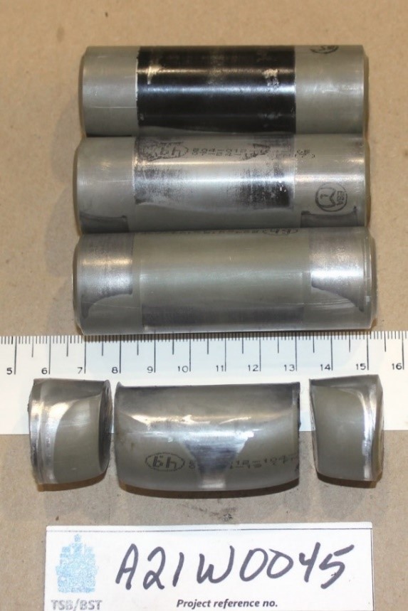 As the manufacturing process continued, each individual pin was assigned a specific serial number, which was stamped onto the end of the pin (operation 110). A detailed inspection was then completed on the batch of pins (operation 120). This inspection was conducted by FMC personnel and included a review of the completed paperwork package to date, a physical and dimensional inspection of a sample of the pins, and a hardness test of all of the pins. The results of the hardness test were recorded in the paperwork that accompanied the work traveller. FMC personnel recorded a hardness value of 50.5 on the Rockwell C scale for pin serial number FNFS90. However, testing of the same pin at the TSB Engineering Laboratory determined that it had an actual average hardness of 7.6 on the Rockwell C scale.