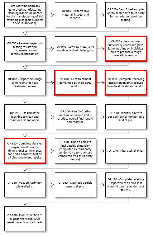 One of the initial steps in the manufacturing process for the pins involved in this occurrence was to send samples from 2 of 8 the raw material rods to a third party for an analysis of the metallurgical properties to ensure that they conformed to the manufacturer’s drawing requirements (operation 020). Both of the test samples passed. However, this represented only 25% of the raw material; the remaining 6 rods were not tested. It is likely that FMC assumed that, because all raw material came from the same manufacturing lot, if the 2 samples passed, all material would pass.