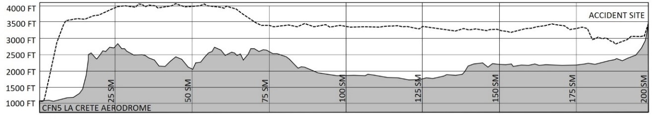 At 1011:40, the aircraft climbed to 3550 feet ASL and its ground speed decreased from 125 knots to 68 knots. The aircraft then started a descent at 1011:59 and descended until shortly after 1012:09, when it impacted terrain in a wooded area at approximately 3200 feet ASL (Figure 3). GPS data from the digital engine monitorFootnote 2 showed that the aircraft’s descent angle before it hit trees was about 15°. The average descent rate was 1680 fpm until a few seconds before impact, when it increased to over 2000 fpm. The pilot was fatally injured. The aircraft was destroyed. The emergency locator transmitter activated.