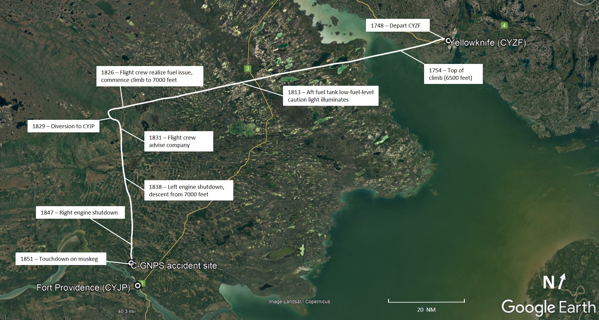 At 1826 (38 minutes after takeoff), when flight TIN223 was approximately halfway to CYFS, the flight crew noticed the illuminated low-fuel-level caution light for the aft fuel tank. The flight crew immediately realized that they had departed with insufficient fuel and began the process of determining where to divert to. It was decided that Fort Providence Aerodrome (CYJP), Northwest Territories, was the closest runway and, at 1829, flight TIN223 turned southbound towards it. During this time, the captain climbed the aircraft to 7000 feet ASL.