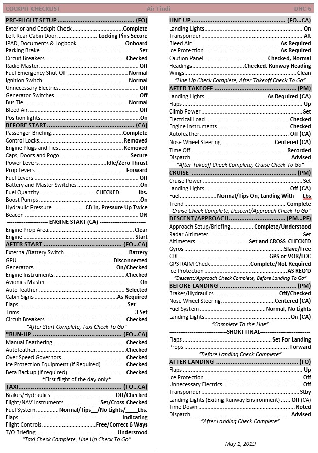 Appendix B – Air Tindi DHC-6 cockpit checklist