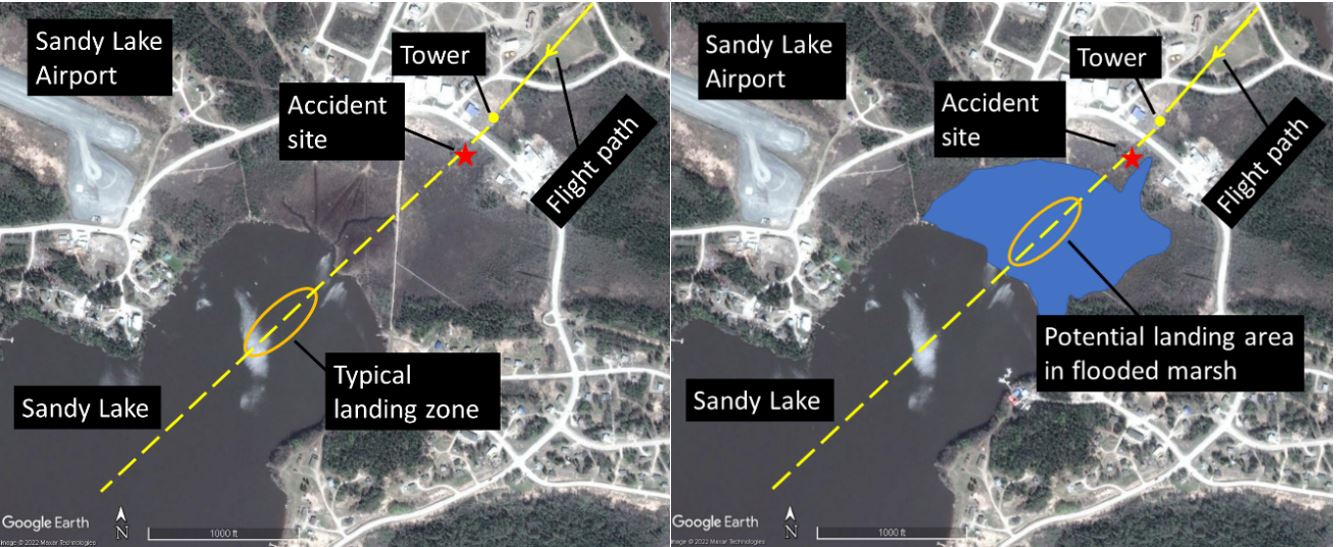At the time of the occurrence, Sandy Lake had a higher-than-normal water level caused by a greater-than-normal snow melt and a rainy spring. As a result, what is normally a marshy area northeast of the landing area was fully submerged in water (Figure 1). The normal elevation of the lake is 901 feet above sea level (ASL).