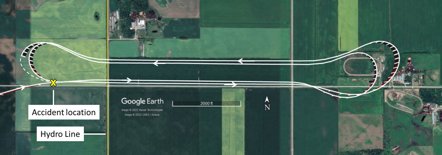 The occurrence flight departed CTN6 at approximately 1950 and the aircraft arrived at the field to be sprayed, located approximately 12 nautical miles (NM) northeast of CTN6, at 2000. The weather was suitable for flight under visual flight rules (VFR). At 2000, an automated weather stationFootnote 3 located at St. Claude, Manitoba (7 NM south-southeast of the occurrence site), recorded the winds as coming from 287° true at 13 knots, gusting to 21 knots. The aircraft conducted 4 runs over the field at approximately 30 feet above ground level and was in a turn to conduct a 5th run when it collided with terrain. The GPS (global positioning system) installed on the aircraft did not record the last moments of the flight (Figure 1).
