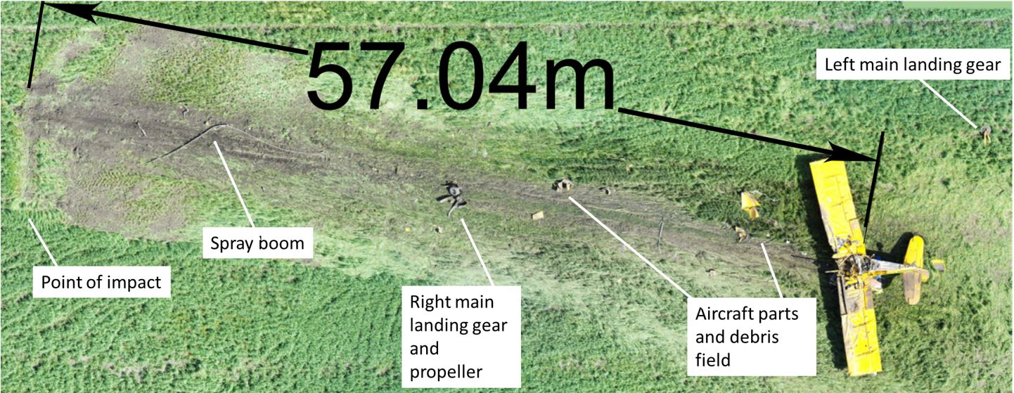 All components of the aircraft were present at the accident site. TSB investigators observed signs of fuel spillage and engine rotation at the time of impact. The wreckage trail consisted of the spray boom, propeller, right main landing gear assembly, pieces of cowling, and pieces of fibreglass material. There was no fire. Flight control continuity was verified. There were no signs of a bird strike or wire strike.