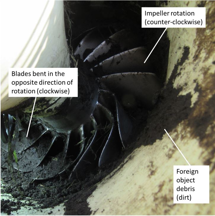 TSB investigators conducted an engine inspection, which revealed that the engine was producing power at the time of impact. The starter generator was removed and the starter generator input shaft was found to be sheared in overload. A visual inspection of the engine inlet revealed that the first stage impeller blades were bent in the opposite direction of rotation (Figure 3). The engine was subsequently sent to Honeywell in Phoenix, Arizona, United States, for an engine teardown inspection, which was attended by a TSB investigator. The inspection confirmed that the engine was producing power at the time of the accident and there were no pre-impact failures.
