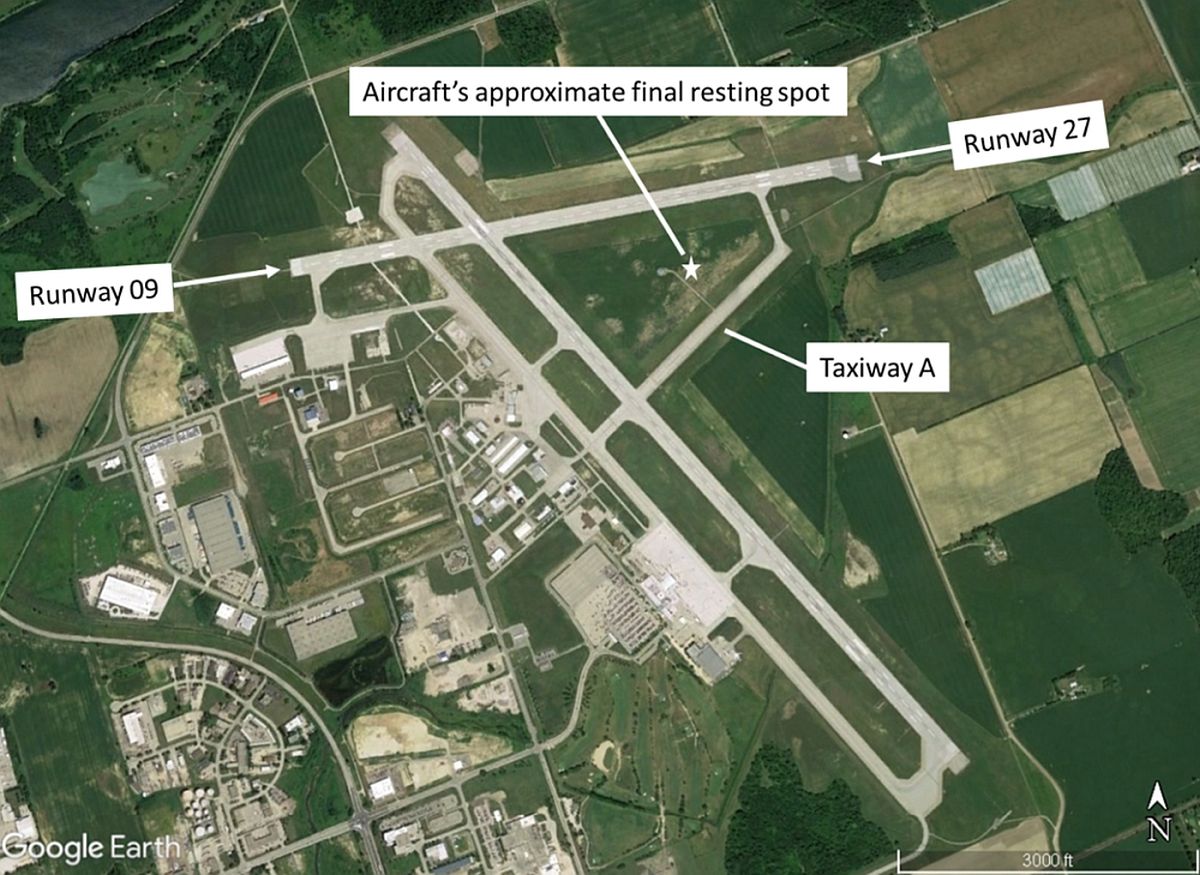 The pilot declared an emergency with air traffic control (ATC) and then intended to land on Runway 27; however, he could not regain complete control of the aircraft and instead attempted to land in a southwest direction on Taxiway A. He eventually landed on the grass between the runway and Taxiway A (Figure 1). On touchdown, the landing gear collapsed and the aircraft slid approximately 265 feet before coming to a stop.