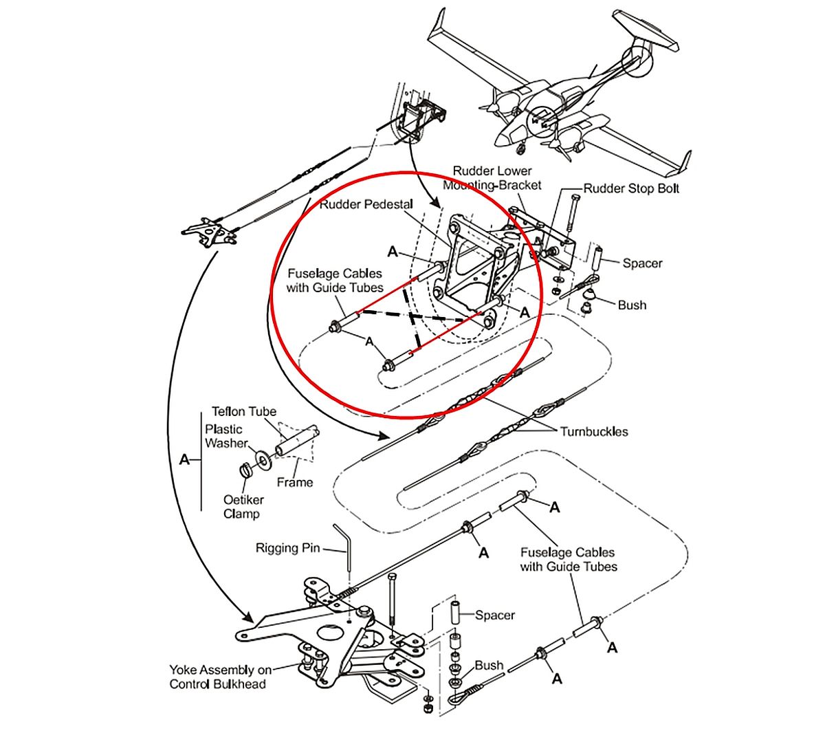 - When the rudder cables were threaded through the rudder cable guide tubes, they also ran in parallel when connected to the rudder lower mounting bracket in the rear of the aircraft. As a result, the rudder moved in the opposite direction of pilot input.