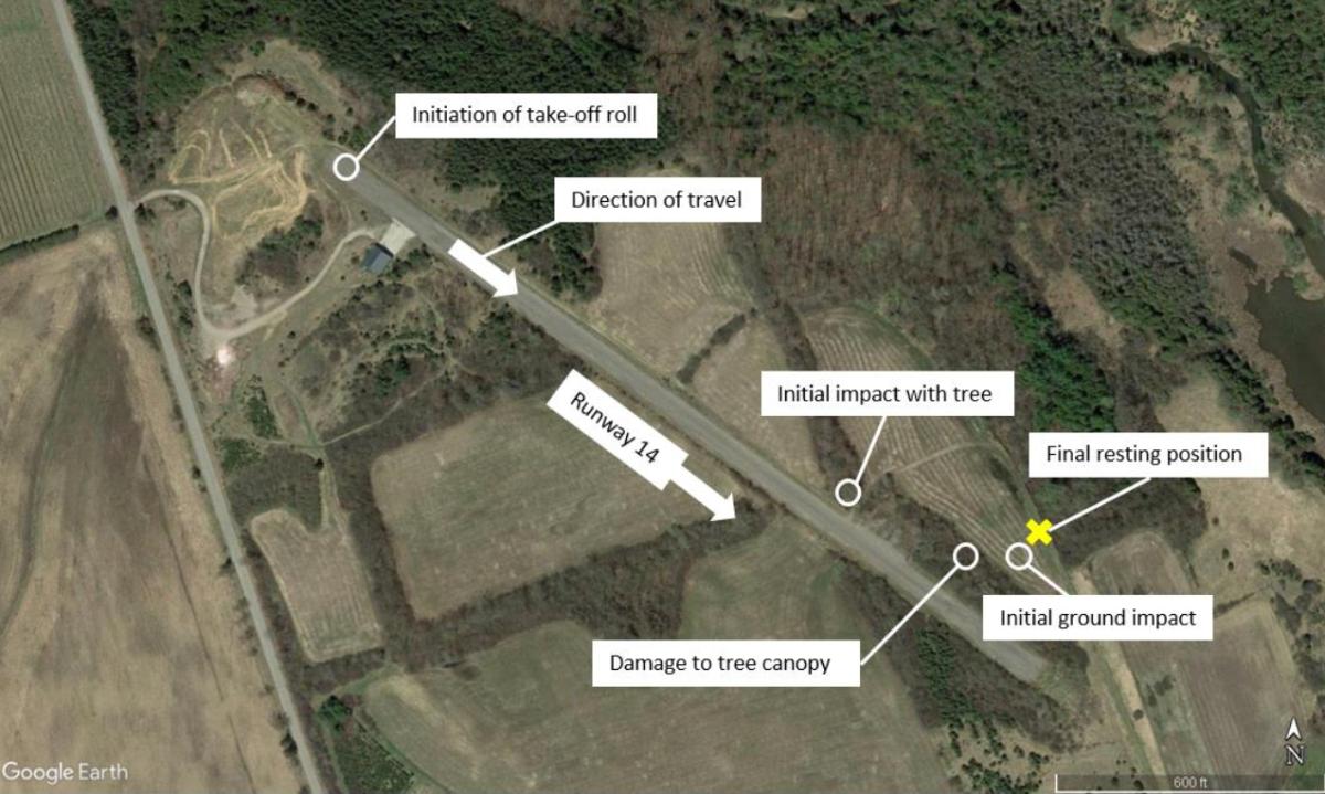 Shortly after becoming airborne, when the aircraft had travelled approximately 1400 feet down the runway and was at a height of approximately 26 feet above ground level, the left wing struck a tree located approximately 40 feet to the left of the runway centreline. Then, the aircraft was seen to veer to the left before disappearing from view. The aircraft then struck multiple additional trees before colliding with terrain,Footnote 2 and came to rest approximately 220 feet to the left of the runway centreline (Figure 1).