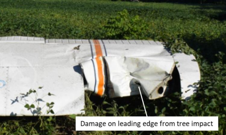 The aircraft struck the ground in a nearly vertical, nose-down attitude; the nose and right wing impacted the ground first, followed by the lower right side of the fuselage. The right wing was nearly separated from the aircraft, and had folded back along the right side of the fuselage. The engine was displaced significantly to the left of the fuselage centreline, and the left wing was relatively undamaged by the ground impact. There were signs of tree strikes along both wing leading edges, the most significant of which was on the outboard leading edge of the left wing, approximately 2 feet inboard from the wing tip (Figure 2).