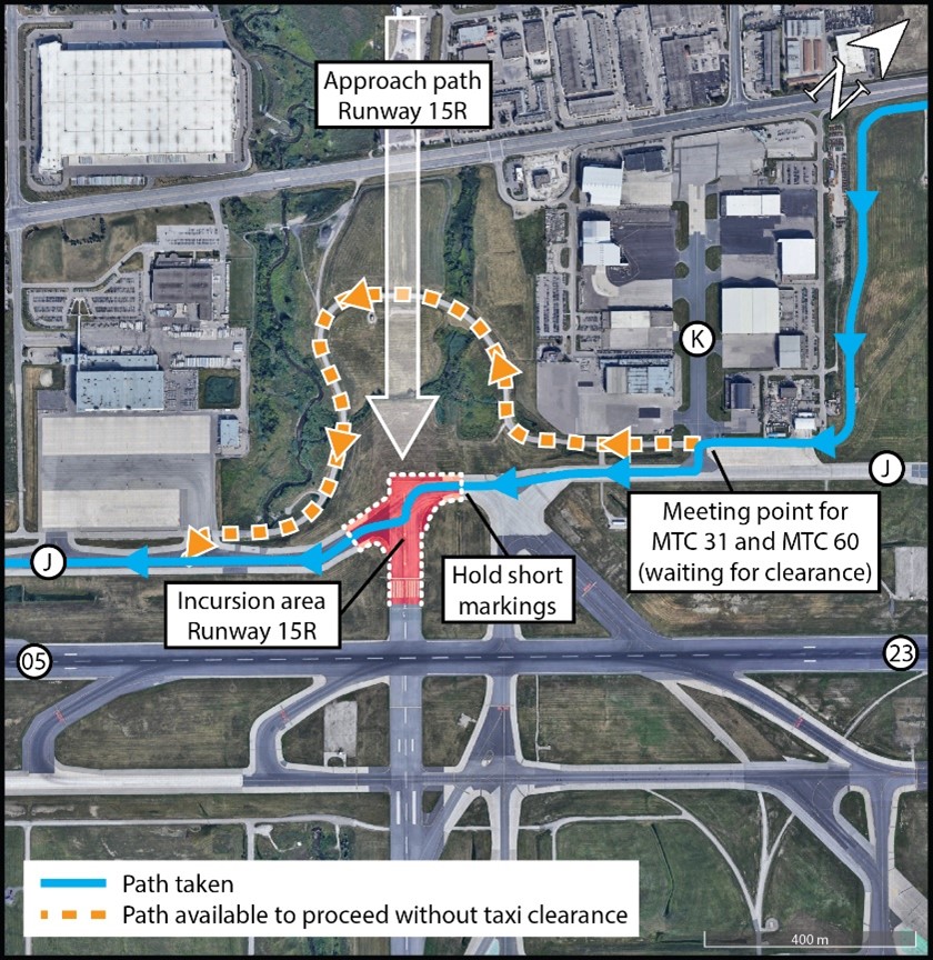Although the North Service Road would have allowed them to drive to a position west of Runway 15R without requiring a taxi clearance or crossing the runway, they instead planned a more direct route via Taxiway J (Figure 1). This route would require a taxi clearance and clearance to cross the runway; however, it was frequently used by the drivers of MTC 31 and MTC 60, as well as other GTAA drivers.