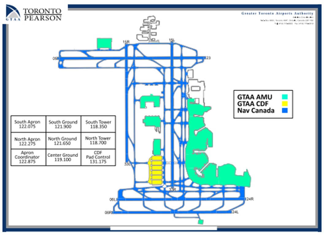 NAV CANADA is the provider of air and vehicle traffic services on the manoeuvring areas at the airport, while the GTAA provides these services for the Apron Management Unit (AMU) and the Central De-icing Facility (CDF) (Figure 2).