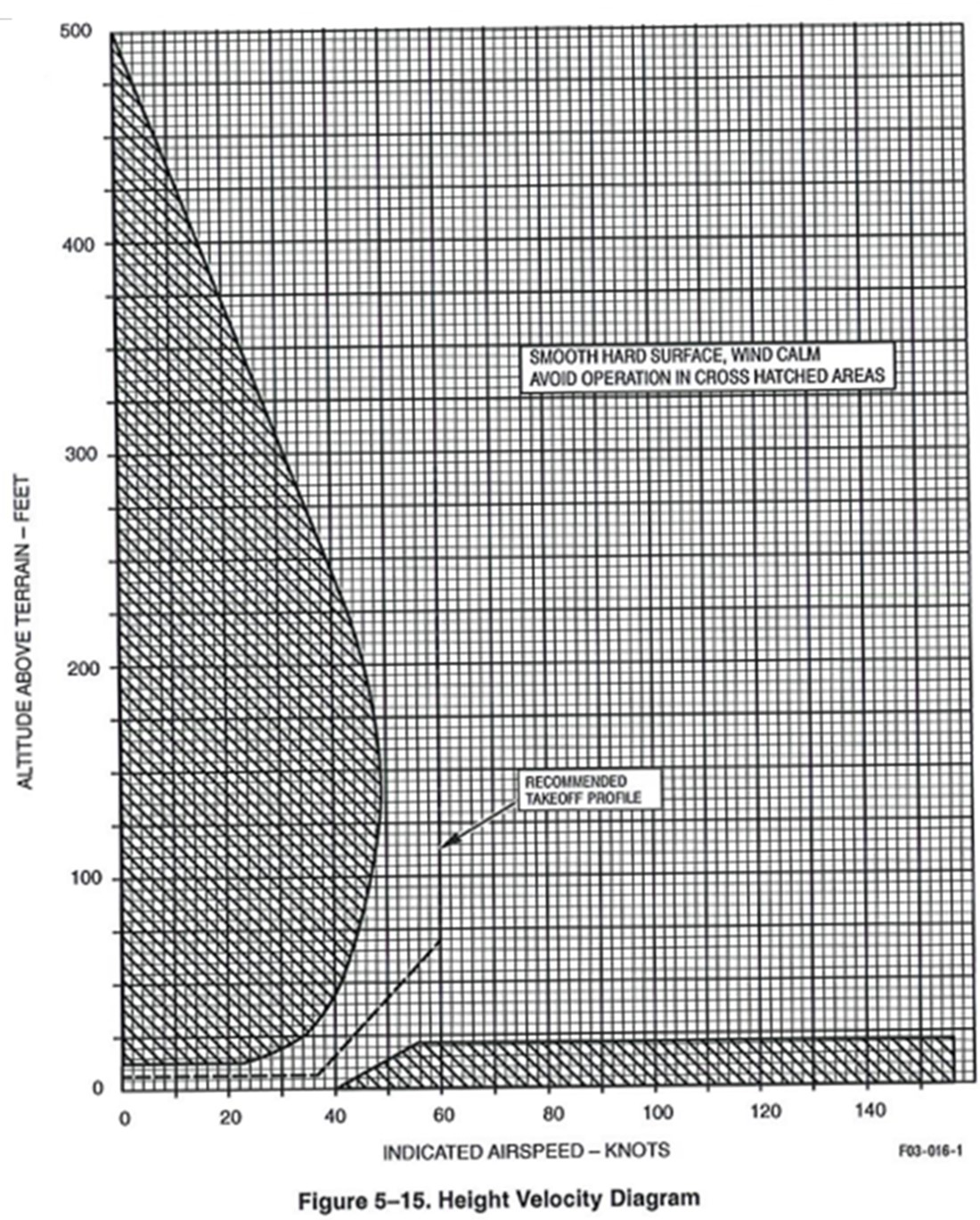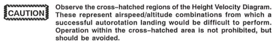 The cross-hatched areas on the height velocity diagram in the 369D flight manual show combinations of airspeed and height above ground that should be avoided because it would be difficult to perform a successful autorotation landing.