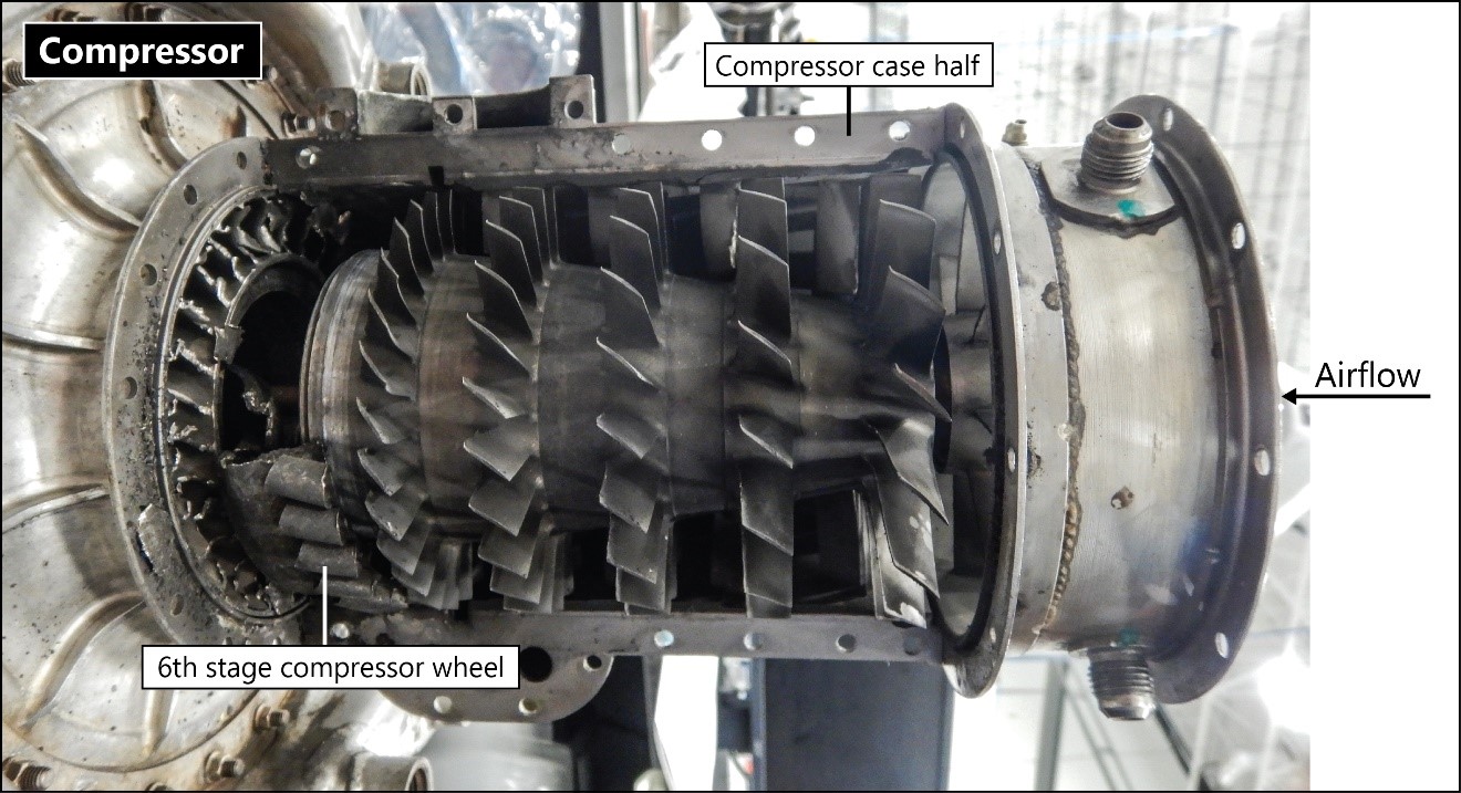 The compressor case halves were replaced on 18 March 2022 after normal wear had been found during a routine inspection. Given the location of the origin of the fatigue crack, near the inner circumference of the sixth stage compressor wheel, this crack could not have been visible during the visual inspection that had been completed when the case halves were replaced.