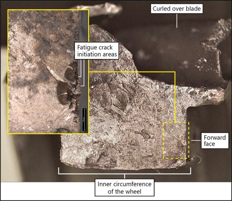 In section 2.1 Sixth stage compressor wheel failure, the sentence “This cracking developed at shrinkage voids that were partially open to the edge, located on the forward face, closer to the inner circumference of the wheel.” was changed to “This cracking appears to have developed at shrinkage voids, some of which appeared to be partially open to the surface, located on the forward face, closer to the inner circumference of the wheel.”