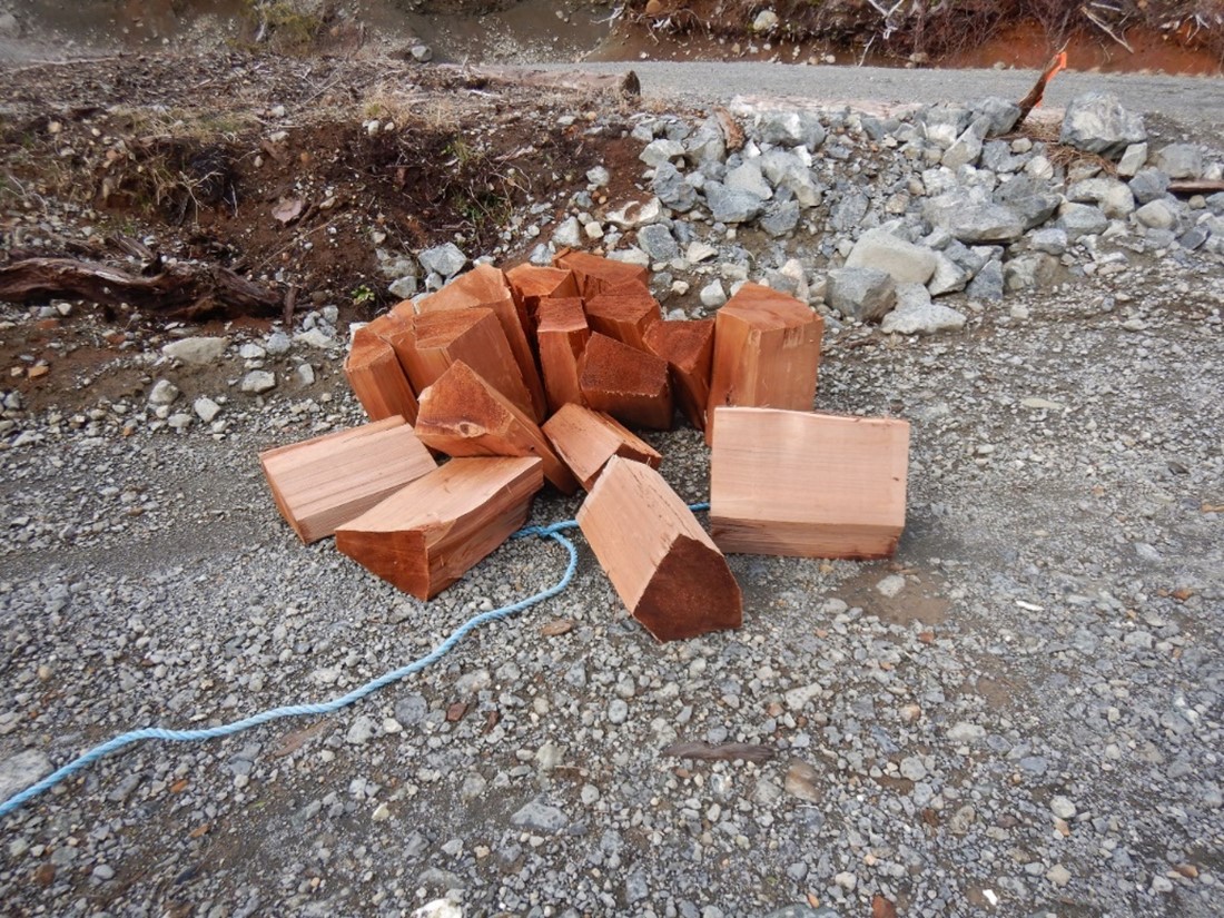 Cedar blocks are cut from dead snags, residual logs too short to be taken out in prime logging, and cedar stumps. They are bound together with rope into bundles that weigh between 700 and 1200 pounds.