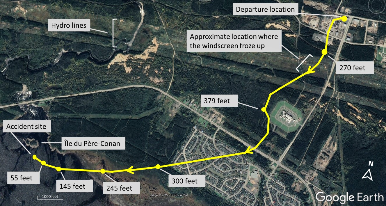 During the descent, the pilot saw Île du Père-Conan in the bay and decided to manoeuvre for a landing close to the trees on the island so that he would have a better visual contrast with the snow-covered surface.