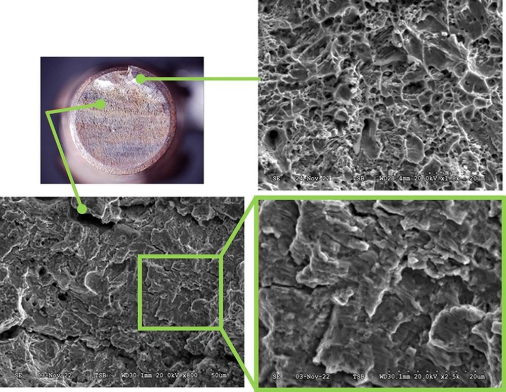 The forward left clevis was examined using a macroscopeFootnote 3 and most of the fracture surface was found to be flat with beachmarks except for a small portion at the end, which was raised and textured (Figure 3, top left image). The clevis was then examined with a scanning electron microscope.Footnote 4 The flat portion of the fracture surface was found to be heavily obliterated, although some striations and secondary cracking (indicative of fatigue) were observed (Figure 3, lower images). No crack initiation sites were found. The raised and textured area observed macroscopically consisted of ductile dimples (Figure 3, top right image), which is indicative of ductile overload.