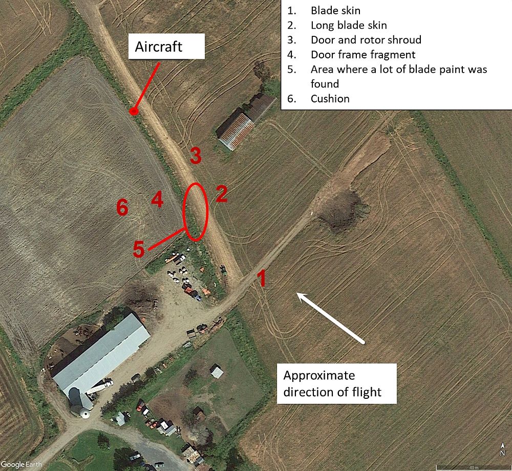 One of the 2 main rotor blades was still in one piece and showed damage consistent with that caused by the impact that had occurred. However, the aluminum skins on the upper and lower surfaces of the 2nd blade (see the Main rotor blades section) were missing. The leading edge of the 2nd blade was still attached to the rotor head and showed no signs of having struck a bird or object in flight. Several fragments of the main rotor blade skin were found southwest of the wreckage, with the furthest being approximately 116 m from the point of impact (Figure 3). The cockpit doors and roof broke off in flight and were found between the aircraft and the furthest blade fragment.