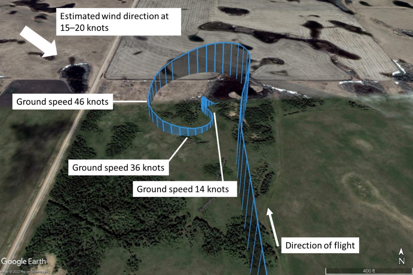 Data collected during the course of the investigation indicated that, although the winds at the time of the accident were reported to be relatively steady at ground level, the flight had been bumpy. The graphic area forecast valid at the time of the occurrence indicated local areas of moderate and severe mechanical turbulence with low-level wind shear, and a low-level jet moving southeast at 50 knots in the vicinity of the accident site. This data was supported by the wind data provided by the atmospheric sounding balloon. Using the weather information available along with the GPS data, the investigation determined that the helicopter likely experienced winds from approximately 300°T (287°M) at 25 knots during the cruise portion of the flight.