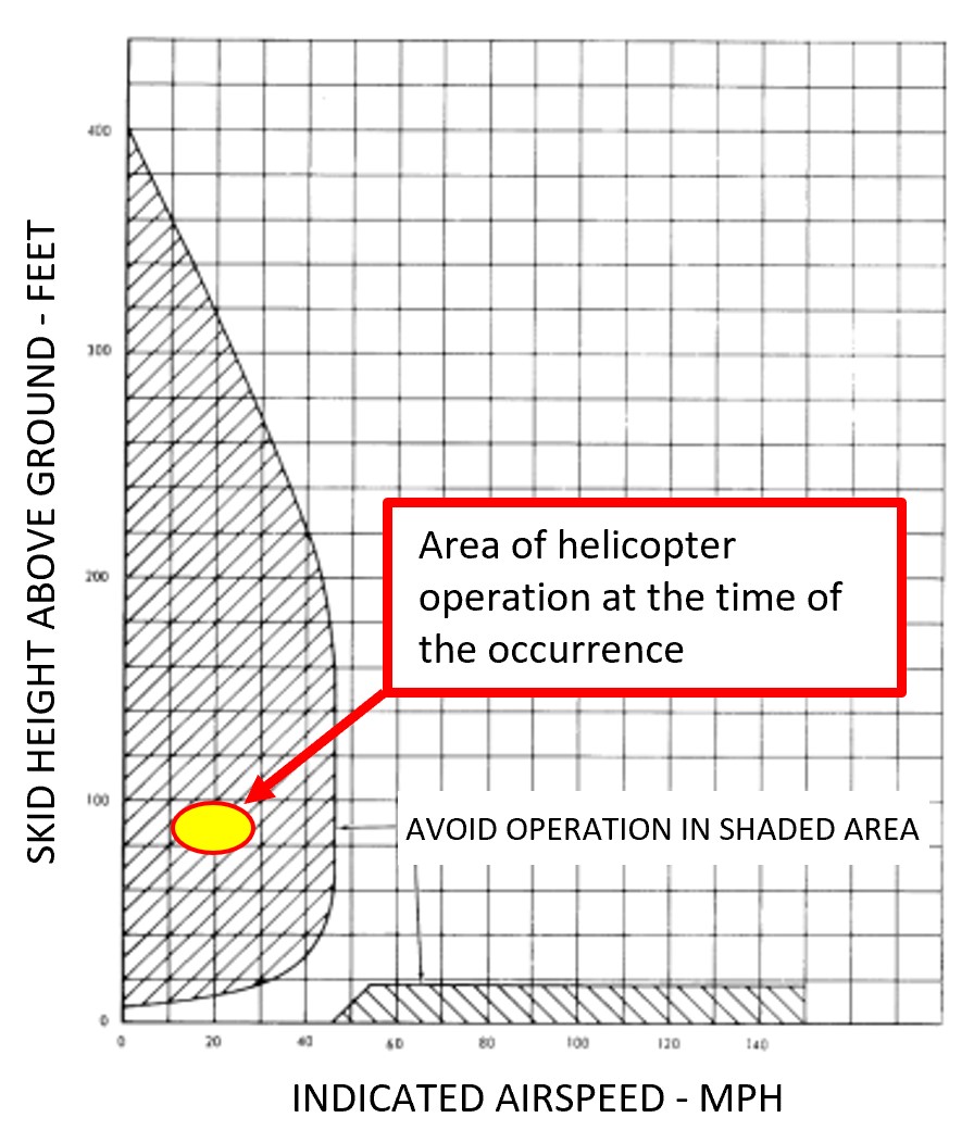 The Bell 206B rotorcraft flight manualFootnote 3 includes a height-velocity diagram (Figure 3), which provides information and guidance to pilots on the safe operation of the helicopter. The height-velocity diagram defines the conditions from which a safe landing can be made following an engine failure in flight (emergency). A notation on the diagram encourages pilots to avoid operation in the shaded area.