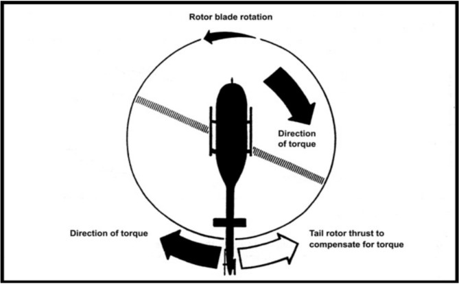 When seen from above, the main rotor blades of the Bell 206B turn counterclockwise. Due to this rotation, the helicopter experiences a torque reaction in the opposite direction, which results in the helicopter yawing to the right (Figure 4).