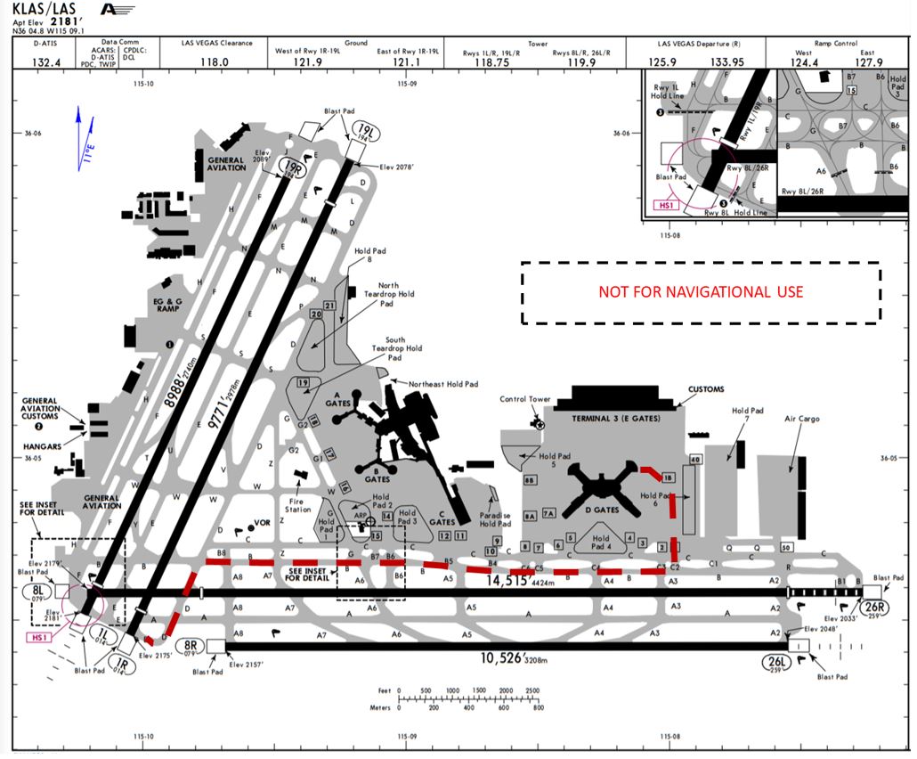 KLAS is an international airport located in Paradise, Nevada, U.S., approximately 5 statute miles south of the city of Las Vegas. Managed and operated by the Clark County Department of Aviation, it is the main airport for the Las Vegas Valley. In 2022, KLAS ranked 5th in the U.S. for the total number of aircraft movements. Footnote 8 The airport is described as having a high tempo of operations to ensure a timely movement of a large number of aircraft.