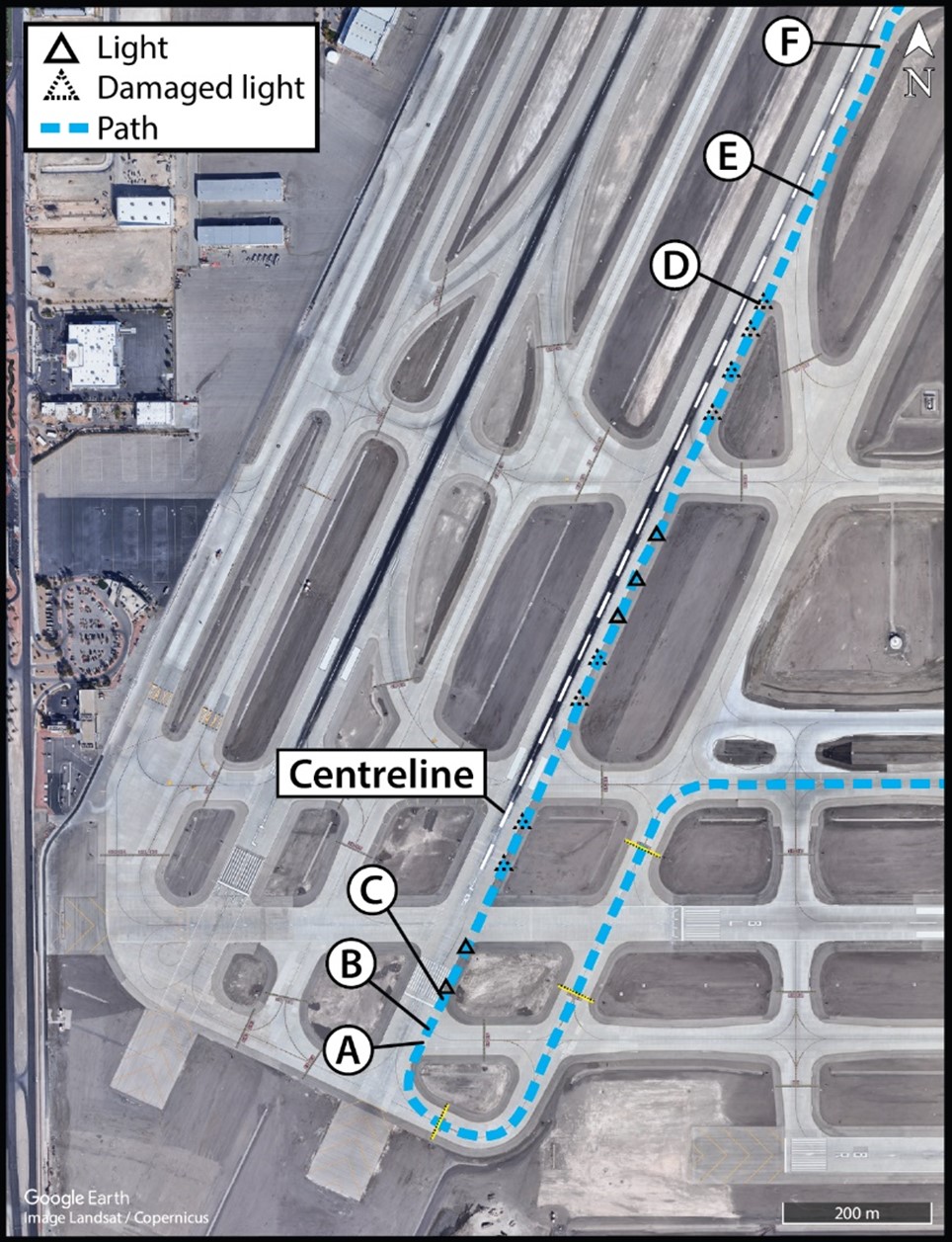 The airport has 4 runways. Runway 01R/19L is 150 feet wide and 9771 feet long. Runway 01R has a permanently displaced threshold distance of 491 feet. The runway’s edge lights have variable brightness settings with a maximum setting of medium intensity. During the occurrence, they were set to setting 1 of 3. Although runway end identifier lights are installed, Runway 01R is not equipped with centreline lighting, nor is it installed on any of the other runways.