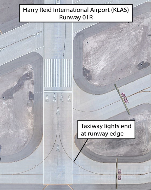 KLAS is equipped with taxiway centreline lighting to assist aircraft in navigating the aerodrome. However, the taxiway centreline lighting on Taxiway D, on which the occurrence aircraft taxied to arrive at Runway 01R, terminates at the runway edge markings, whereas the taxiway centreline markings continue to the centre of the runway. This complies with the U.S. Federal Aviation Administration (FAA) standard stipulating that taxiway centreline lead-on lighting cannot be installed within the confines of the runway where operations are not conducted below 1200 feet (365 m) runway visual range, which applies to KLAS operations.