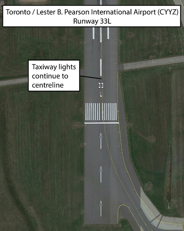 The standard differs from that which applies to Canadian airports, where taxiway centreline lighting can continue onto runways even if they are not certified for low-visibility operations. Although the intention of the U.S. standard is to reduce excessive lighting in the runway area, in this occurrence, it created a potential hazard by stopping a key visual indicator partway to the aircraft’s intended destination, ending it instead at the runway edge markings. The termination of these lights at the runway edge markings reduces their salience during nighttime operations and made it more likely that the occurrence crew would have had to rely on other cues to align the aircraft properly.