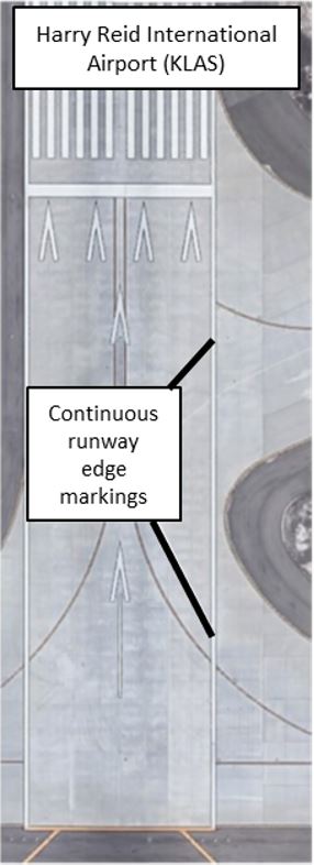 In the fall of 2023, KLAS implemented a 3-phase plan to address runway and taxiway conspicuity. Phase 1, which was completed in the fall of 2023, consisted of installing taxiway shoulder markings on the north side of taxiways A and D from the hold bar at each taxiway to the runway edge line of Runway 01R.