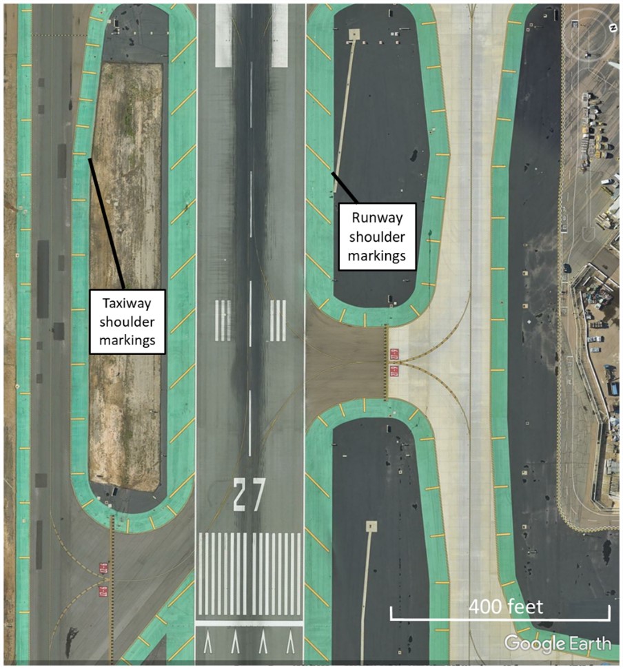 A possible defence that can aid flight crews in determining whether they are on the edge of a runway or taxiway is shoulder markings. These yellow lines help to highlight paved areas that are not meant for use by aircraft but can be difficult to differentiate from active runway and taxiway surfaces. These are not required markings but they can provide additional visual cues to help flight crews determine their location when taxiing and lining up on runways at airports with a significant amount of paved surface. At the time of the occurrence at KLAS, Runway 01R did not have runway shoulder markings, nor did Taxiway D have taxiway shoulder markings where it intersects with Runway 01R.