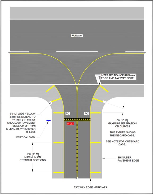 Taxiway shoulders can also feature markings that make it clear that those areas are not part of the taxiway surface. Such markings, which are also painted yellow, consist of stripes oriented perpendicular to the taxiway centreline (Figure 10).Footnote 19