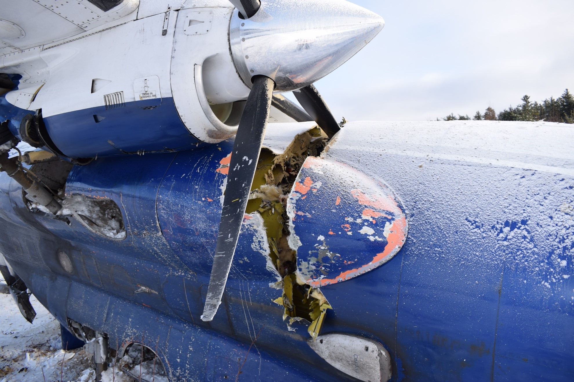 After the engines were shut down, the occupants began evacuating. The right emergency exit was damaged and would not open, so they egressed through the aircraft’s main door, which was located at the rear, on left side of the aircraft. A significant fuel leak was noted. The occupants walked the short distance to the runway, where the snow was between 6 to 8 inches deep on the runway surface. The flight crew called 911 and the London Flight Information Centre (FIC) to report the accident.