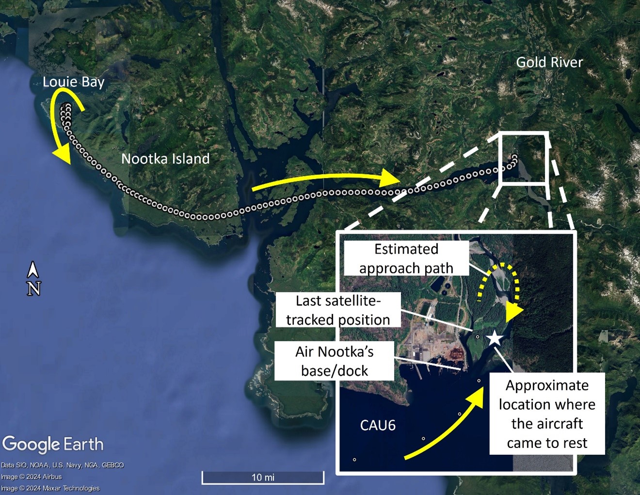 On 28 July 2023, the Air Nootka Ltd. (Air Nootka) De Havilland DHC-2 Mk. I (Beaver) aircraft (registration C-FZVP, serial number 1033) was conducting a visual flight rules repositioning flight from Louie Bay on Nootka Island, British Columbia (BC), to Gold River Water Aerodrome (CAU6), BC, with only the pilot on board. On arrival at CAU6, the pilot noted a rough sea state in the company’s primary landing area and elected to land in the secondary area, a tree-lined river to the east of the base. The aircraft was observed overflying the company dock to the north and then turning right, aligning with the southwest direction of the river. When descending on the alignment turn to final approach, the aircraft experienced an uncommanded yaw and roll. It abruptly turned further right, heading west, and continued to descend toward the trees. It was reported that opposite aileron input, to try and arrest the uncommanded yaw and roll, increased the roll rate. At approximately 1720,All times are Pacific Daylight Time (Coordinated Universal Time minus 7 hours). the aircraft struck the forested area on the west side of the river, coming to rest approximately 75 feet from the river (Figure 1). There was no post-impact fire. The pilot received serious injuries, was extracted by local firefighting personnel, and attended to by local paramedics. He was then airlifted to hospital by a search and rescue helicopter.
